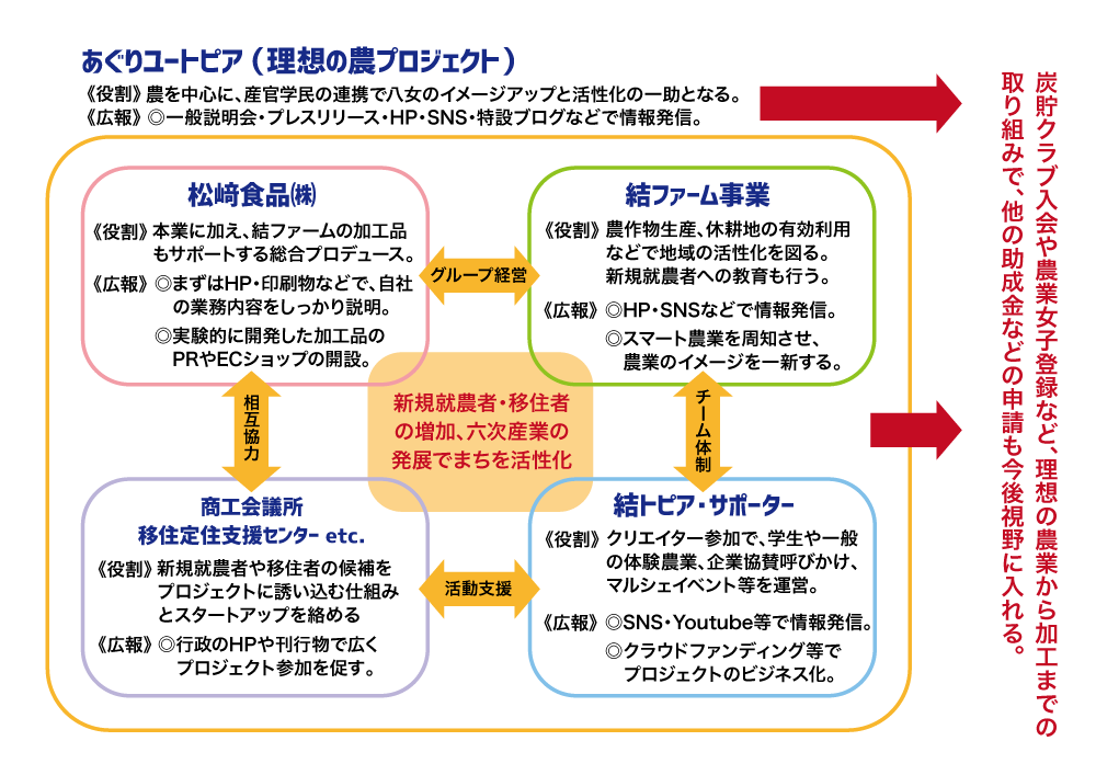 きつい・汚い農業からの脱出、竹炭を使った土作りなど、人や環境に優しい農業のユートピアを、民間・行政・教育機関と連携して目指す構想もあります。新規就農者に憧れられる農業プロジェクトにすることで、八女市ならびに近隣の活性化にも繋がることでしょう。